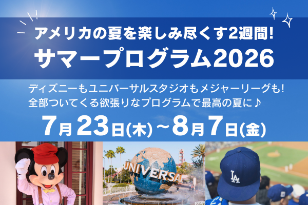 【女子にお勧め】 ・映えスポット満載!テーマパークで夢の毎日 ・ホームステイでリアルな英語&文化にふれられる ・メジャーリーグ観戦でアメリカの熱狂を体感 ・はじめての海外も安心!治安バツグンの街 ・遊びも学びも両立!英語がぐんぐん身につく夏
