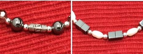 (写真右)エレガント:黒い艶のスクエアな鉄鉱石と白く細長いパール調のコンビ。腕を細く繊細に見せてくれます。